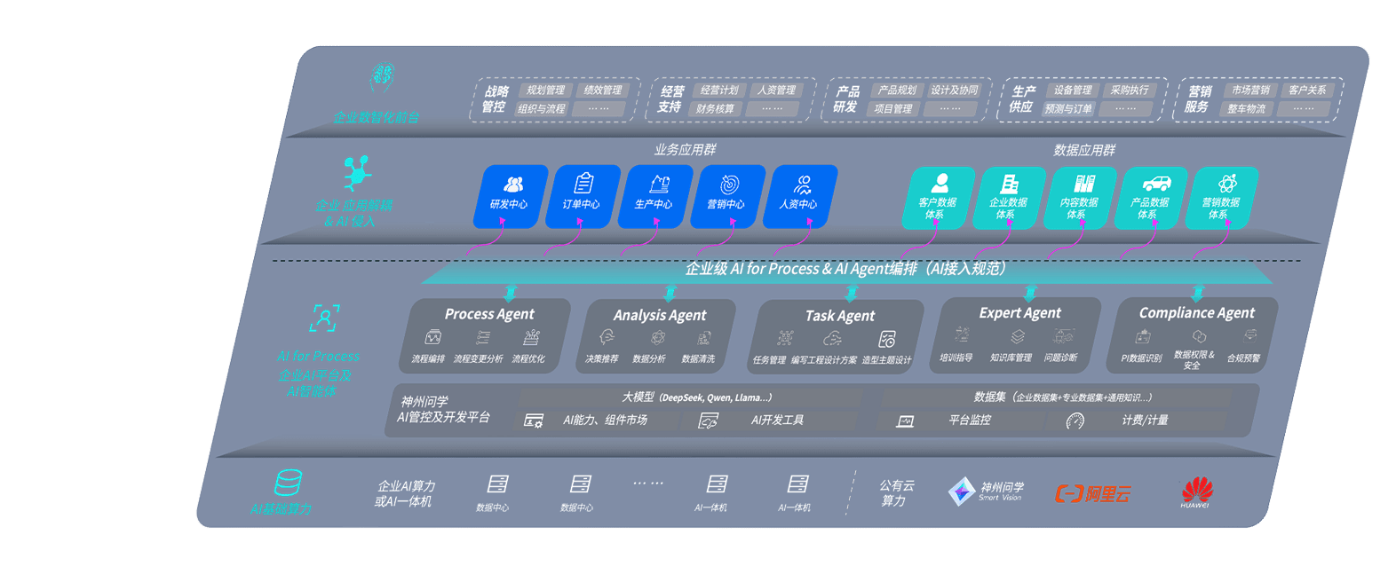 端到端的一站式AI工作空间深度融合了从企业战略规划到日常经营的全流程业务板块,,,,定向解决车企内部领域多、、部门多、、、链条长、、、、场景碎片化等难题,,支持车企快速构建以AI为核心的生产力写作体系,,,实现任务执行与AI能力的无缝集成与交互