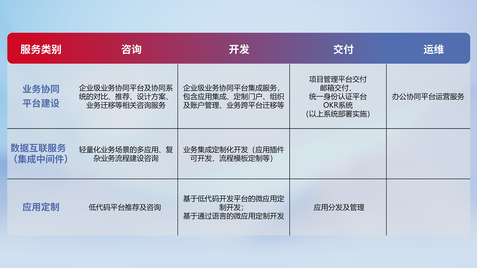 针对钉钉、、、企微、、、IDaas等平台级产品提供产品的规划、、方案、、、、交付、、、、定制化开发等服务,,,,实现如统一协同办公、、、智能客户服务、、、、混合会议管理、、、、智能数据查询、、、、等业务场景,,,,实现数字化转型。。